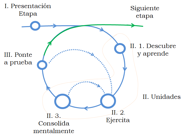 En Soroban en la escuela proponemos un método de aprendizaje donde los alumnos y alumnas son los protagonistas de su propio aprendizaje. En la siguiente imagen os muestro los pasos que se siguen: